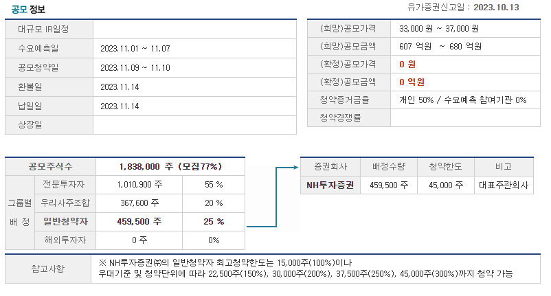 | 동인기연 | 11월 9일 ~ 11월 10일 | 33,000원 ~ 37,000원 | NH투자증권 계좌개설 |