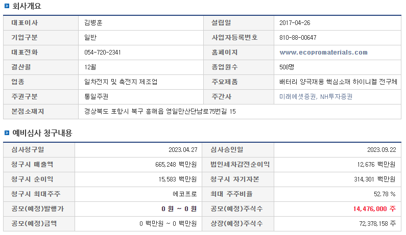 에코프로머티리얼즈 공모주 청약 주관사 상장 일정 수요 예측 경쟁률 (0) | 2023.11.08 |